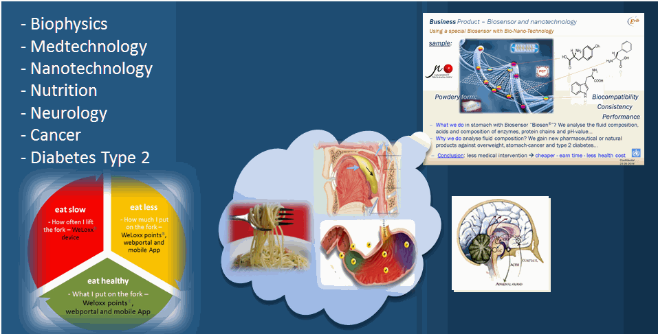 Nous avons une mission qui permet aux gens de prendre leurs propres décisions concernant leur santé avec WeLoxx. Notre vision convainc clients une relation à long terme de confiance avec Erib et son équipe. Nous offrons des solutions claires. Nous résolvons le problème de la surcharge pondérale, l'obésité et le diabète avec des produits qui ont une technologie étonnante à l'intérieur et une équipe qui peut exécuter. Erib SA est une entreprise de BionNanomedtech suisse, qui fait portables médicaux dispositifs sans fil en combinaison de pilule biologique avec biocapteurs à avaler pour l'analyse de liquide gastrique et diagnostic. Les brevets d' Erib et pendings de Patend permettent durabilité. Dans notre deuxième phase parallèle, nous avons une solution pour les personnes de type 2 diabète.